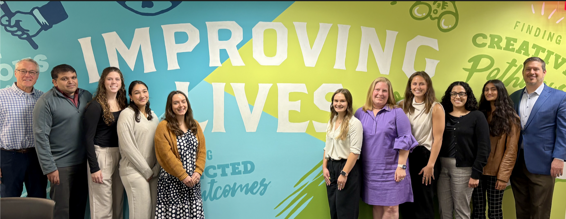 (Above, members of the Applied Policy team welcome summer interns in front of the Improving Lives mural in our Alexandria)